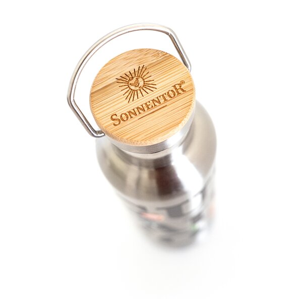 Auf dem Foto ist der Deckel der Thermosflasche zu sehen. Oben ist er aus Holz und darin ist das Sonnentor Logo eingraviert.