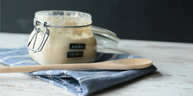 Der fertige Sauerteig fühlt sich am wohlsten in einem Schraub- oder Bügelglas, bei dem der Deckel nicht fest verschlossen ist. Der Teig kann so bei Zimmertemperatur aufbewahrt werden. Alle zwei Tage wird der Sauerteig mit 2 EL Roggenmehl und 4 EL Wasser gefüttert, so bleiben die Milchsäurebakterien bei Laune.